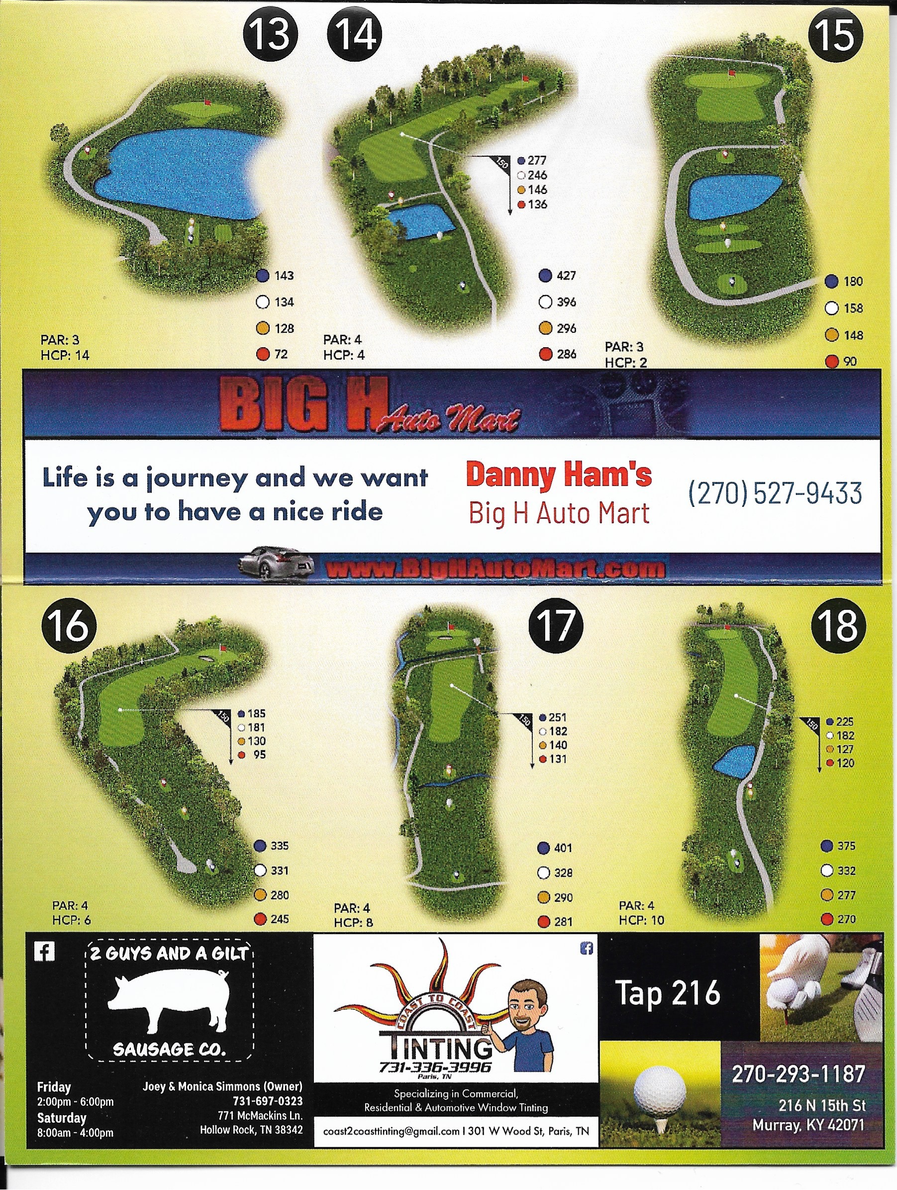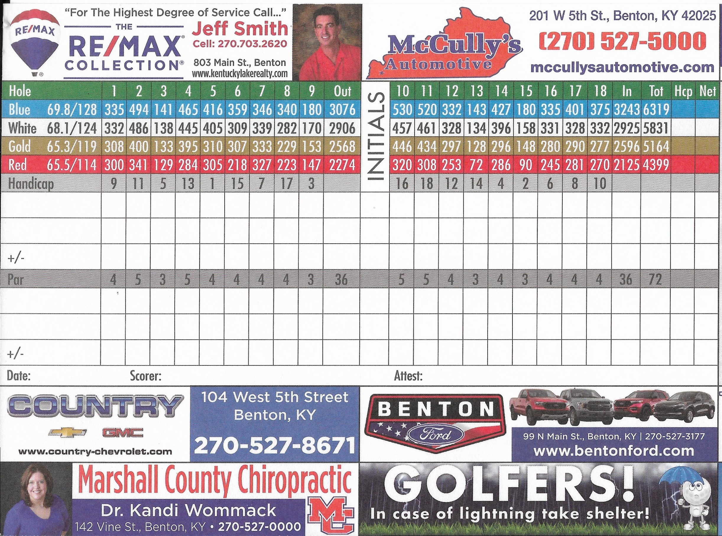 Benton Country Club is adjoined by several homes and lawns where persons, including children, are often present. Benton Country Club strongly discourages players intentionally attempting shots which create a heightened and unnecessary risk of the golf ball striking property or person. Such shots include, but are not limited to, #10 approach shot over creek and house to left; #14 tee shot left toward house; #16 tee shot over trees right; #17 approach shot over house.